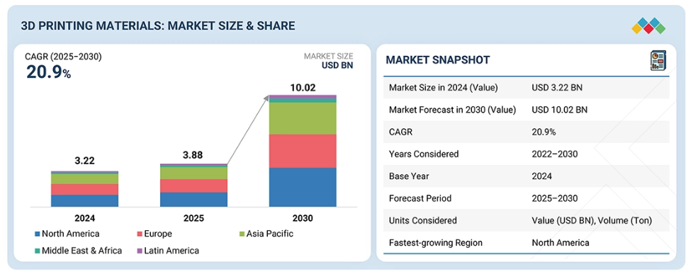 3Dプリンティング材料市場は、2025年の38億8,000万米ドルから2030年までに100億2,000万米ドルに達すると予測されており、2025年から2030年までの年間平均成長率(CAGR)は20.9%と見込まれております。