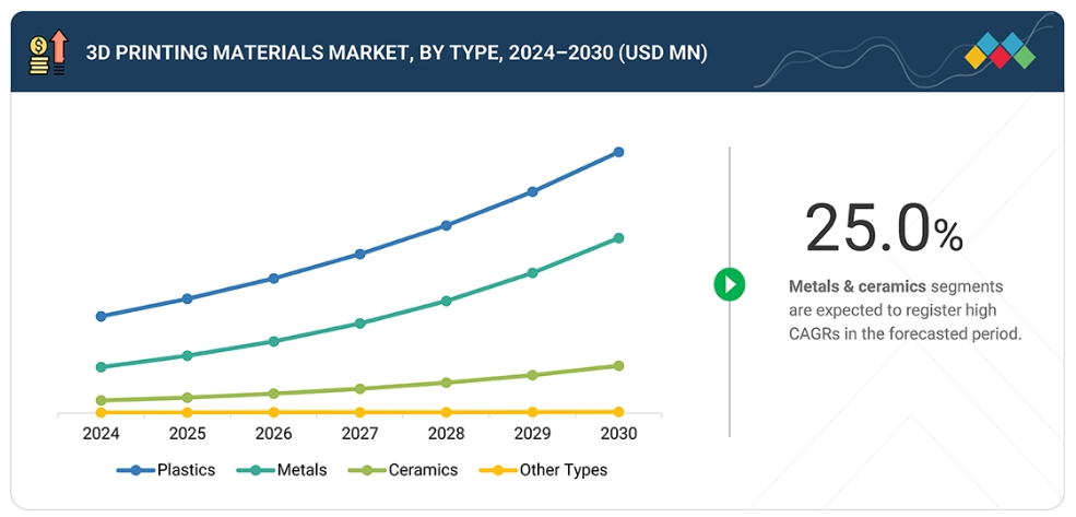 3Dプリンティング材料市場は、プラスチック、金属、セラミックス、その他の種類で構成されています。金属とセラミックスは、予測期間中に金額ベースで最も高いCAGR(年平均成長率)を記録すると見込まれています。
