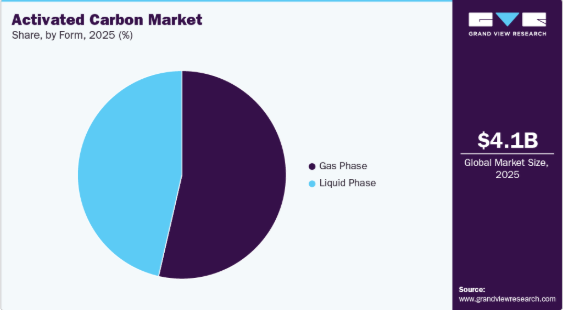 2025年には気相セグメントが54.1%の最大収益シェアを占めました。これは、大気質管理、産業排出物制御、規制順守に対する世界的な重視の高まりが牽引したものです。活性炭は揮発性有機化合物(VOC)、硫黄化合物、その他の有害大気汚染物質を吸着する効果に優れており、排ガス処理、溶剤回収システム、自動車排出ガス制御技術において重要な構成要素としての地位を確立しています。米国大気浄化法、ユーロ6基準、中国の大気汚染防止・管理行動計画などの厳格な規制が発効したことで、製造、発電、化学工業などの産業は、活性炭ベースのガス浄化ソリューションの採用を余儀なくされています。この変化が、このセグメントの収益優位性に大きく貢献しています。