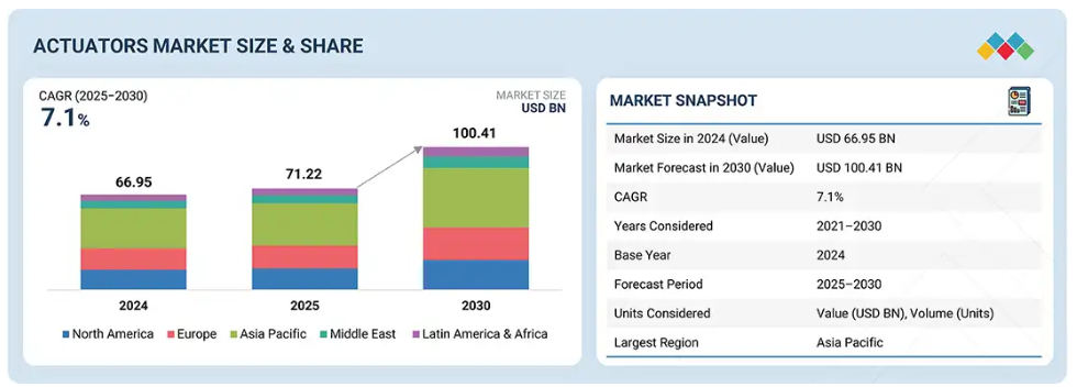 世界のアクチュエータ市場は、予測期間中に年平均成長率(CAGR)7.1%で成長し、2025年の712億2,000万米ドルから2030年には1,004億1,000万米ドルに達すると見込まれております。