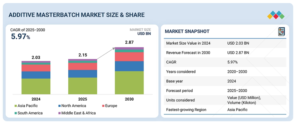 添加剤マスターバッチ市場は、2025年の21億5,000万米ドルから2030年までに28億7,000万米ドルへ、金額別で年平均成長率(CAGR)5.97%で成長すると予測されています。