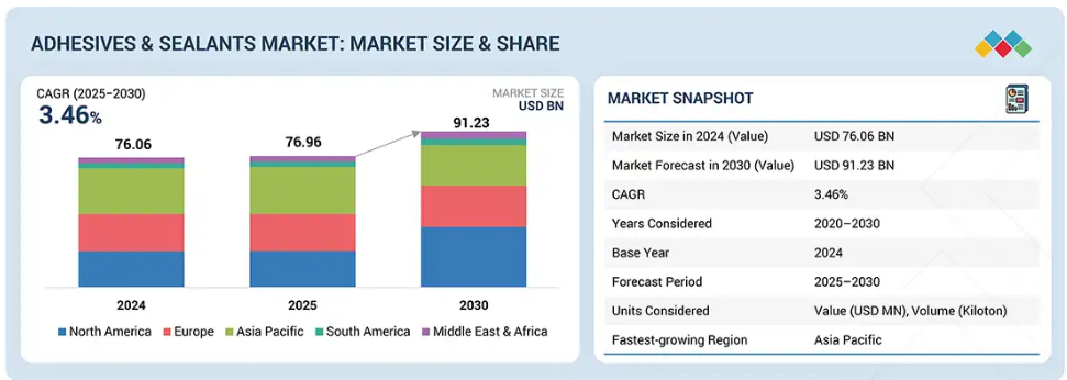 接着剤・シーラント市場は、2025年の769億6,000万米ドルから2030年までに912億3,000万米ドルに達すると予測されており、2025年から2030年までの年間平均成長率(CAGR)は3.46%と見込まれています。接着剤・シーラントは、材料を接着・密封・保護するために設計された特殊な化学配合剤です。接着剤は主に、包装から建設に至る様々な用途において、耐久性と強度を確保しながら二つの表面を長期間保持するために使用されます。