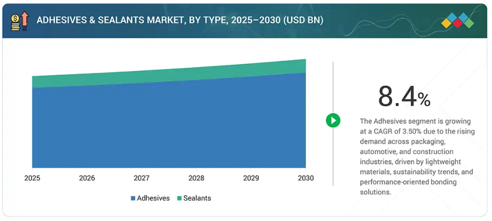 一方、シーラントは、二つの表面を接合すると同時にその間の隙間を充填し、湿気、塵、化学物質などの環境要因に対する保護バリアを提供するために使用されます。接着剤・シーラントは、自動車、電子、医療、包装、建設を含む様々な産業において、製品の性能、耐久性、効率性を高める上で重要な役割を果たしています。世界の接着剤・シーラント市場は、電子商取引分野の成長、食品・飲料包装産業の発展、そして世界的な持続可能な包装ソリューションの推進により拡大を続けております。