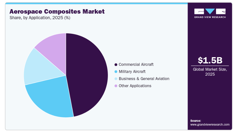 2025年、ガラス繊維セグメントは、そのコスト効率の良さや構造部品および内装部品への幅広い適用性により、58.6%という最大の売上シェアを占めました。ガラス繊維複合材料は、炭素繊維と比較して大幅に低コストでありながら、優れた強度、耐食性、および耐衝撃性を提供します。これらの材料は、特に民間航空機やリージョナル航空機において、レドーム、フェアリング、内装、および二次構造に広く使用されています。高い生産量と確立された製造プロセスが、その優位性をさらに支えています。このセグメントは、加工や修理の容易さという利点があり、OEMやMROプロバイダーにとって魅力的な選択肢となっています。大量生産される航空機プログラムからの安定した需要が、売上高における主導的地位を維持し続けています。