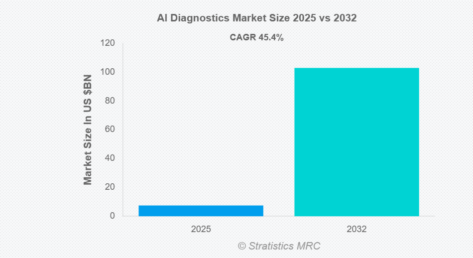 Stratistics MRCによると、世界のAI診断市場は2025年に74億8,000万ドル規模となり、予測期間中に年平均成長率(CAGR)45.4%で成長し、2032年までに1,028億7,000万ドルに達すると見込まれています。