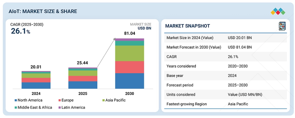 AIoT市場は、予測期間中に年平均成長率(CAGR)26.1%で成長し、2025年の254億4,000万米ドルから2030年までに810億4,000万米ドルに達すると見込まれております。