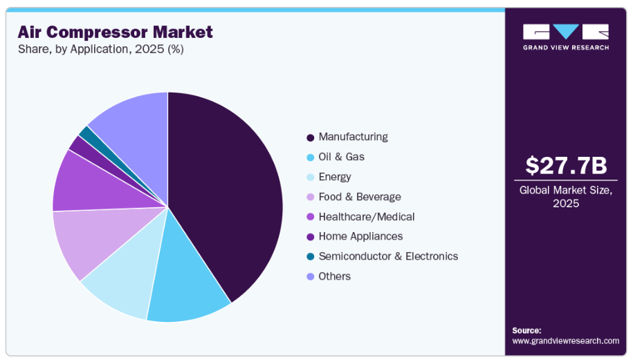 - 2025年、アジア太平洋地域は売上高シェア42.8%を占め、空気圧縮機市場を牽引しました。