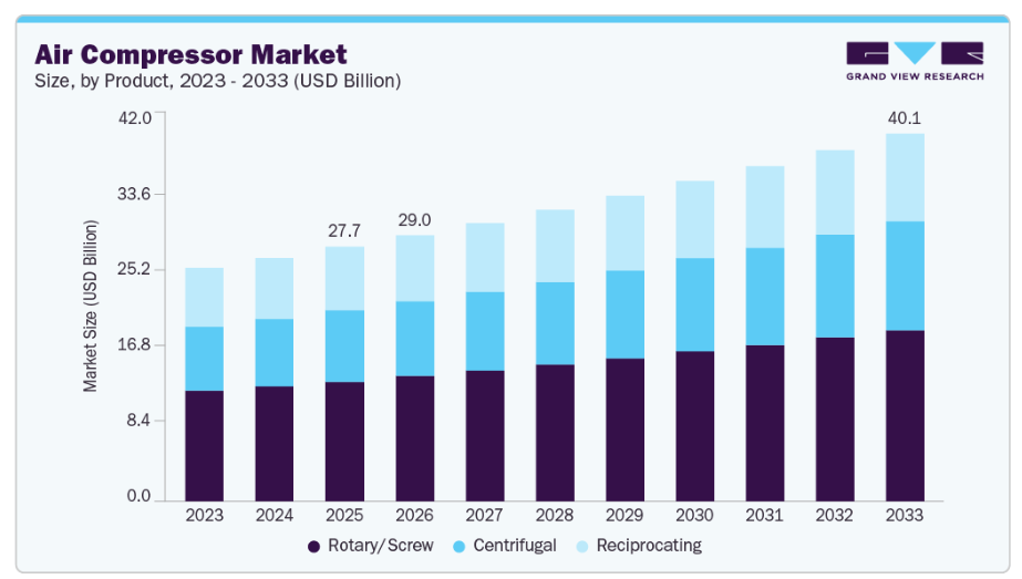 さらに、「メイク・イン・インディア」や「メイド・イン・チャイナ2026」といったイニシアチブの下、現地製造を促進するための政府のインセンティブが、コンプレッサーの導入を加速させています。HVACシステムや医療機器などの非産業用途における圧縮空気の利用拡大も、市場を後押ししています。