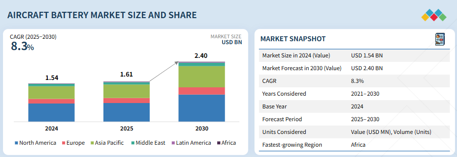 航空機用バッテリー市場は、2025年の16億1,000万米ドルから2030年までに24億米ドルへ、年平均成長率(CAGR)8.3%で成長すると予測されております。