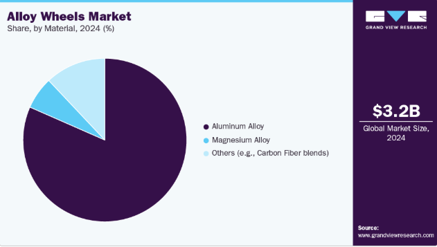 乗用車セグメントは市場を牽引し、2024年には58.1%という最大の収益シェアを占めた。これは、燃費効率と車両の美観を向上させる軽量で高性能なホイールの需要増加が要因である。世界的な中級・高級乗用車の生産・販売拡大、および電気自動車(EV)への移行傾向の高まりが、この成長に大きく寄与している。消費者のパーソナライズされたスタイリッシュなホイールデザインへの嗜好の高まりと、先進的な製造技術の組み合わせが、このセグメントの需要をさらに押し上げている。