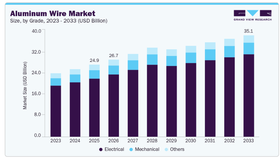 本レポートでは、2021年から2033年までの世界、国、地域ごとの売上高および販売量の成長を予測し、各サブセグメントにおける最新の動向を分析しています。本調査において、Grand View Researchは世界のアルミニウム線市場レポートをグレード、用途、地域ごとに分類しました: