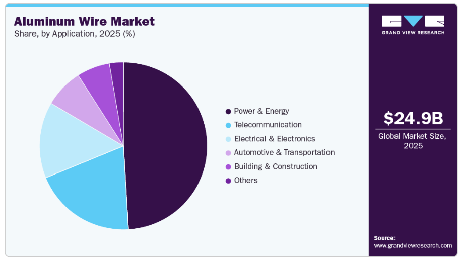 再生可能エネルギーの統合に伴い、送電および送電網拡張プロジェクトが急増しています。2025年2月、中国国家電網は、超高圧(UHV)送電線および長距離送電プロジェクトを支援するため、アルミニウム線およびケーブルの調達量を大幅に増やしました。これらのプロジェクトは、再生可能エネルギーが豊富な地域から需要地へ電力を送電することを目的としており、軽量性、コスト効率、および架空送電への適性から、アルミニウム導体の需要を直接的に増加させています。2024年から2025年にかけてアジアや南米アメリカで発表された同様の送電網強化イニシアチブも、持続的な市場需要を支え続けています。