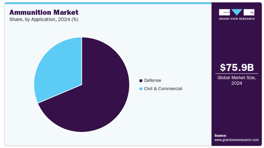 防衛セグメントは、世界的な地政学的緊張の高まりと防衛支出の増加を背景に、2024年に市場を支配し、最大の収益シェア66.8%を占めました。調達活動は、精密誘導弾薬や環境持続可能な弾薬による兵器庫の近代化を通じた国家安全保障の強化に焦点を当てています。戦略的防衛協力と革新的弾薬技術への研究開発投資が、このセグメントの成長を支えています。