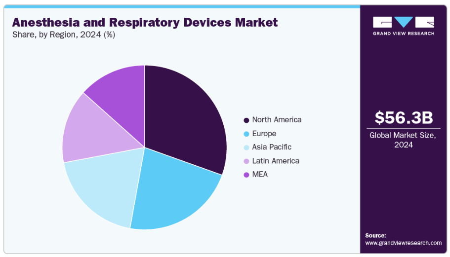 • 北米は2024年に麻酔・呼吸器機器市場で30.5%のシェアを占め、市場を牽引しました。