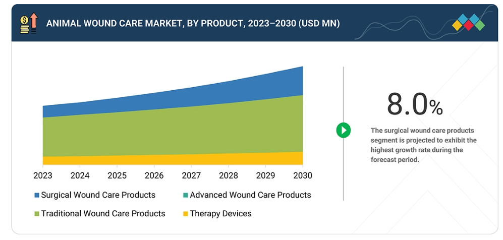 製品別では、動物創傷ケア市場は外科用創傷ケア製品、先進創傷ケア製品、従来型創傷ケア製品、治療機器に分類されます。2024年時点で、外科的創傷ケア製品セグメントが市場で最大のシェアを占めました。この顕著なシェアは、外科的介入を必要とする獣医学的疾患の増加、獣医療現場における外科的創傷ケア製品の採用拡大、ペットの人気の高まり、ペットケアへの支出増加など、複数の要因に起因すると考えられます。