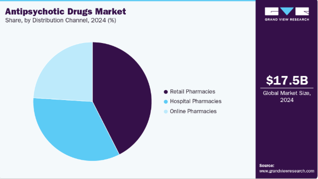 小売薬局セグメントは市場を支配し、2024年に最大のシェアを占めた。小売薬局は患者が容易に利用でき、処方薬を必要とする個人の最初の接触点として機能することが多い。小売薬局は、様々な精神疾患を持つ患者のニーズに応えるため、幅広い抗精神病薬を取り揃えています。薬剤の使用方法や潜在的な副作用に関するアドバイスやサポートを提供することで、その人気を高めています。多くの患者は、特に長期治療において、利便性から抗精神病薬の調剤に小売薬局を好みます。