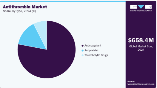 抗凝固剤セグメントは、血栓塞栓症の予防・治療用治療剤としてのアンチトロンビンの広範な使用を背景に、2024年に78.03%という最大の収益シェアで市場を支配した。このセグメントには血漿由来および組換えアンチトロンビン製品が含まれ、遺伝性アンチトロンビン欠乏症、深部静脈血栓症、大手術時の合併症などの管理に不可欠である。需要はさらに、心臓手術件数の増加、血栓関連疾患への認識の高まり、安全性と有効性を向上させる抗凝固療法の進歩によって支えられている。