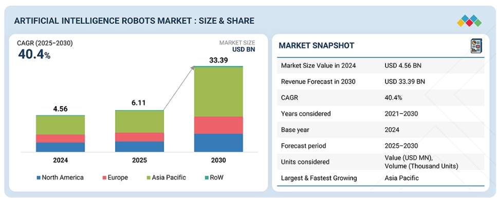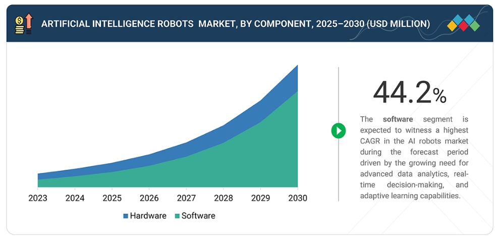 AIロボット市場において、サービスロボットは2025年から2030年にかけて40.7%という最高CAGRを記録すると見込まれています。