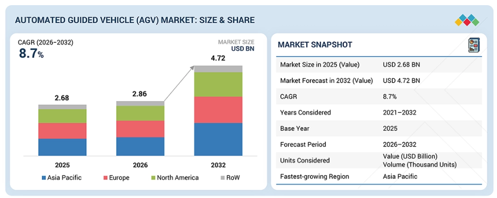 自動搬送車(AGV)市場は、生産現場、倉庫、物流業務におけるAGVの導入拡大に伴い、堅調な成長が見込まれております。一貫した資材移動、高スループット、手動依存度の低減に対する需要の高まりが、最適化された経路設定、交通制御、タスクスケジューリング、リアルタイムの業務可視化を支援するAGVシステムの導入を加速させております。ナビゲーション技術、フリート調整ソフトウェア、バッテリー性能、システム統合の進歩により、信頼性、拡張性、システム全体の効率性が向上しています。運用コストの抑制と資材フローの安定化に向けた自動化投資が強化される中、AGVは接続された高効率な資材搬送環境の中核要素として台頭しています。