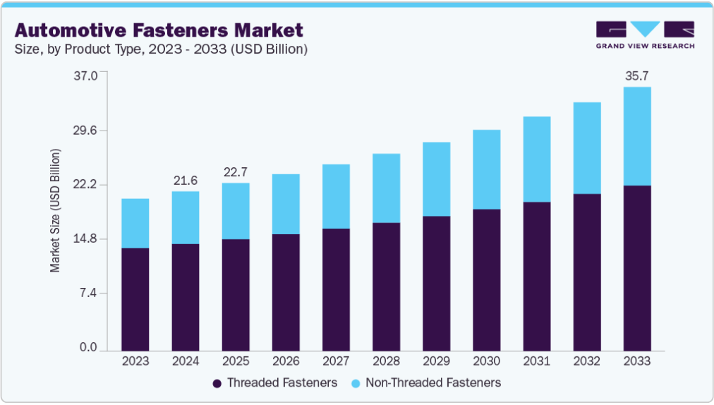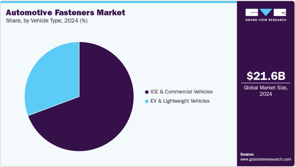 ねじ式締結部品セグメントは2024年に67.1%の最大シェアを占めました。ボルト、ねじ、スタッドなどのねじ式締結部品は、高い機械的応力に耐え、保守性を可能にする特性から、シャーシ、パワートレイン、内装部品、およびバッテリー筐体で広く使用されています。自動車組立での普及、高い耐荷重性、金属・プラスチック基材との互換性、分解・保守の容易さといった要因が同セグメントの成長過程を支えている。