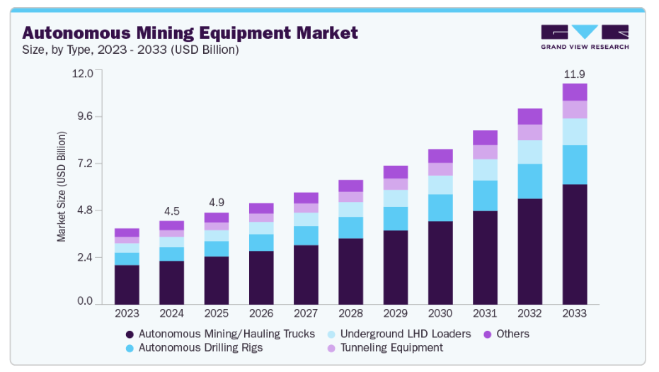 ■ 英語タイトル:Autonomous Mining Equipment Market Size, Share & Trends Analysis Report By Type (Autonomous Drilling Rigs, Underground LHD Loaders), By Mining (Surface Mining, Underground Mining), By Application, By Region, And Segment Forecasts, 2025 - 2033
