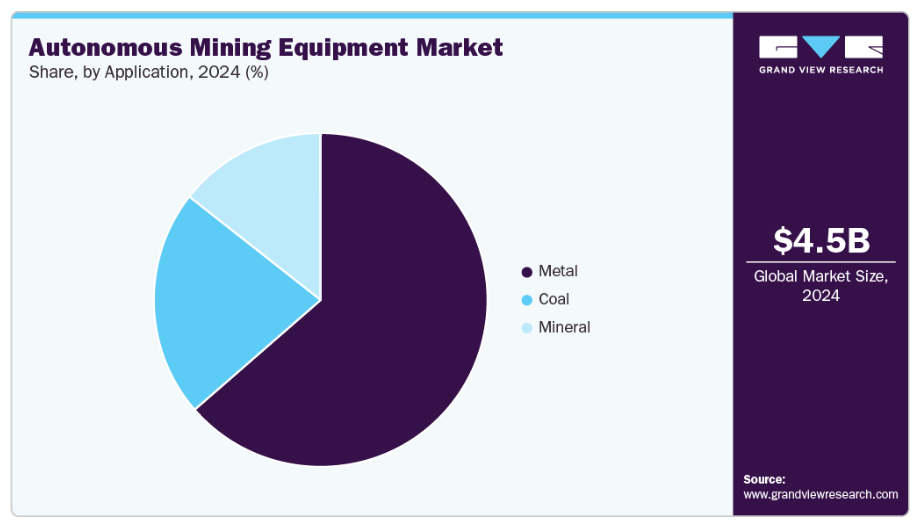 金属セグメントは2024年に自律型採掘機器市場を牽引し、予測期間中に著しいCAGRで成長すると見込まれています。自律型設備は金属採掘、特にバッテリーやクリーンエネルギーインフラに使用されるリチウム、銅、ニッケルなどの需要の高い金属において広く採用されています。鉱山事業者が積極的な採掘目標を追求する中、自律システムはサイクルタイムの短縮、操業変動の低減、一貫した品位管理を実現しています。これらのソリューションは、手作業による操業が物流的に複雑な遠隔地、高地、またはその他のアクセス困難な鉱床からの生産最大化にも不可欠です。