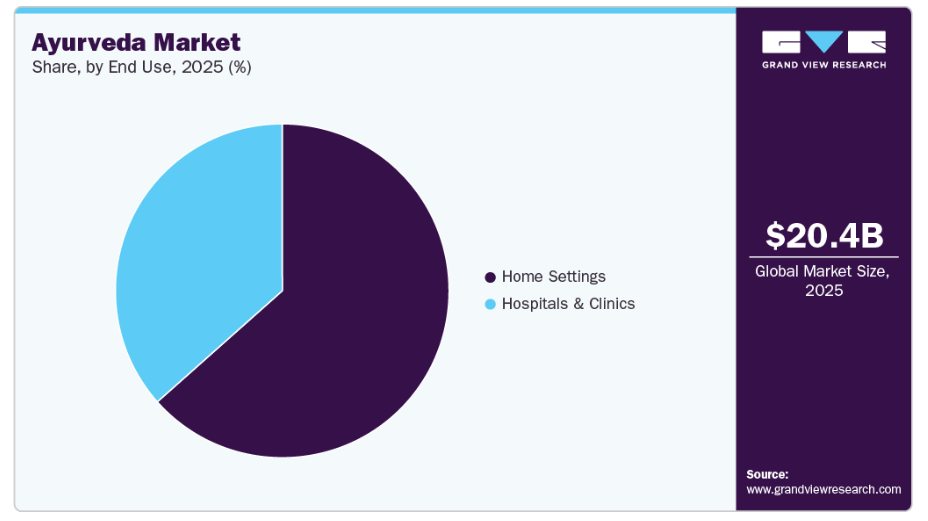 家庭用セグメントは2025年に63.44%という最大の市場シェアを占め、予測期間中に大幅な成長が見込まれています。慢性疾患の増加も、ストレス緩和や消化器サポートなどアーユルヴェーダが提供する代替療法への需要を後押ししています。さらに、アーユルヴェーダの主流医療への統合とデジタルヘルスプラットフォームの進歩により、遠隔地においてもアーユルヴェーダ製品や相談がより利用しやすくなっています。アーユルヴェーダ製品の人気拡大もこの成長に寄与しており、消費者が家庭環境においてスキンケアやヘアケアの自然療法を求める傾向が強まっているためです。