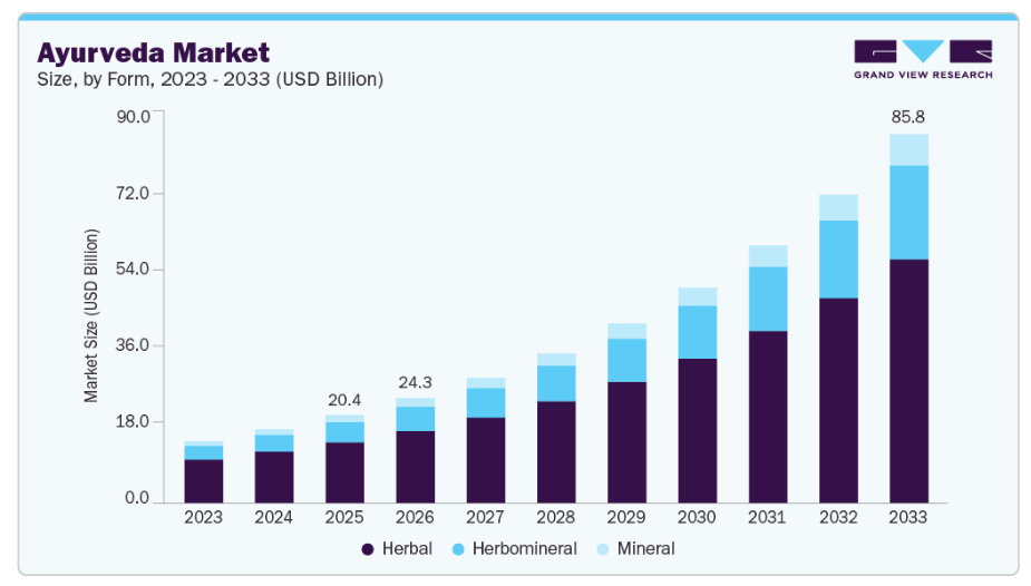 この成長は主に、慢性疾患の増加傾向、アーユルヴェーダの効能に対する認知度の向上、そして消費者層全体におけるアーユルヴェーダの強い採用と受容に起因しております。
