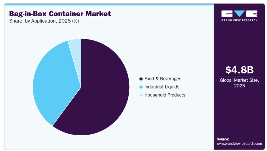 2025年には、1~5リットルセグメントが33.2%超の最大の市場収益シェアを記録しました。これはワイン、フルーツジュース、牛乳、食用油などの飲料に使用される最も一般的で汎用性の高いBIBサイズの一つです。家族向けまたは小規模商業利用に十分な容量でありながら、取り扱いの容易さも兼ね備えています。包装は通常、頑丈な外箱に内袋と注ぎ口を組み合わせた構造です。消費者や企業は、複数の小容量ボトルと比較してコスト効率に優れ、保管スペースを削減できる点からこの容量を好みます。さらに、エコフレンドリーな包装への傾向、すなわち大容量BIBが1リットルあたりのプラスチック使用量を最小限に抑える点が、その採用を後押ししています。