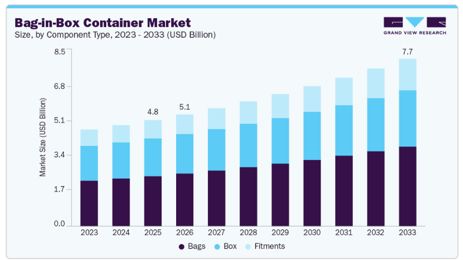 フィッティングセグメントは、予測期間中に7.3%という最も高いCAGRで成長すると予想されています。フィッティング(タップまたはディスペンサーとも呼ばれます)は、袋から液体を制御して注ぐための機構です。これらは通常、ポリプロピレン(PP)やポリエチレン(PE)などの食品グレードプラスチックで製造され、重力式タップ、プッシュ式タップ、レバー式タップなど様々なデザインがあります。フィッティングは漏れ、汚染、酸化を防ぐように設計されており、開封後も鮮度を維持する必要がある製品にとって極めて重要です。外食産業における店内消費やセルフディスペンシングシステムの普及が、BIB産業における高度なフィッティングの需要を牽引しております。