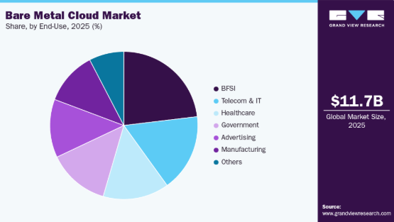2025年には、BFSI(銀行・金融・保険)セグメントが23.0%という最大の市場シェアを占めました。これは、同セグメントが極めて高い規制要件とパフォーマンス要件を抱えていることが根本的な要因です。金融機関がリアルタイム分析、複雑な定量モデル、大規模なストレステストへの依存度を高めるにつれ、共有環境ではよくある干渉を受けず、予測可能な超低遅延のパフォーマンスを提供するインフラストラクチャに加え、機密データのための強力な物理的およびネットワーク上の分離が求められています。ベアメタルに固有のこの専用かつシングルテナントの性質は、PCI DSS、HIPAA、および地域のデータ居住法といった重要な規制コンプライアンス要件に対応します。これらは、標準的な仮想化されたパブリッククラウドサービス内では確実に満たすことが困難な要件です。