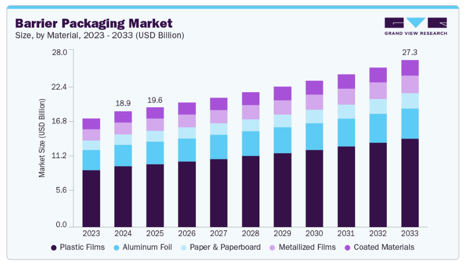 バリア包装は、酸素、湿気、光、汚染物質などの外部要因から保護するシールドを提供します。これらの要因は、特に食品、飲料、医薬品において、消費財の新鮮さ、風味、安全性を損なう可能性があります。世界的な貿易が拡大し、サプライチェーンが複雑化する中、製品はより長い距離を移動し、様々な気候条件下でも安定性を維持しなければなりません。これにより、製品の完全性を維持し、安全性、衛生、長期使用性を確保する包装材料への強い需要が生まれています。その結果、製造業者と小売業者の双方が、腐敗の防止、店頭での魅力向上、製品の返品や廃棄の最小化を目的として、バリア包装の採用を拡大しております。