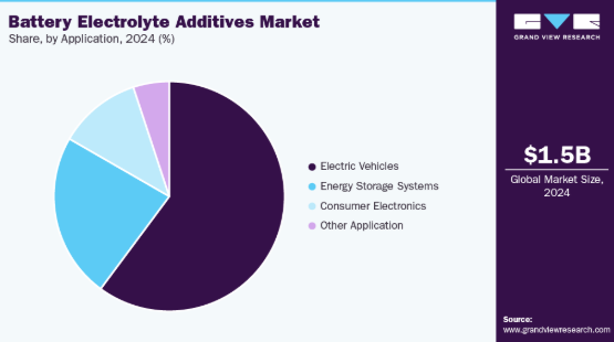 電気自動車(EV)セグメントは、世界的な電動化輸送への急速な移行を背景に、2024年に60.1%という最大の収益シェアで市場をリードした。EV生産台数の増加、政府の補助金政策、消費者採用の拡大が、サイクル寿命・安全性・エネルギー効率を向上させる先進添加剤に依存する高性能リチウムイオン電池の需要を牽引している。EV電池におけるビニレンカーボネートなどの添加剤の普及は、同セグメントの優位性をさらに強化している。