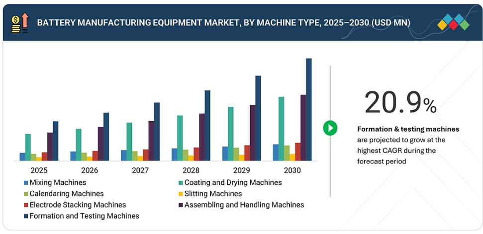 2024年には、電池形成・試験装置が31.6%と最大のシェアを占めました。これは、大規模なリチウムイオン電池セル生産において、電池の性能、安全性、品質検証を確保する上で重要な役割を担っているためです。