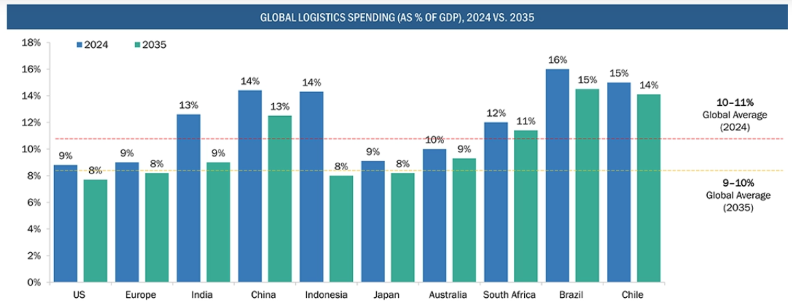世界の物流支出がGDPに占める割合は現在、世界的に10~11%の範囲にあり、2035年までに約9~10%まで低下すると予測されています。