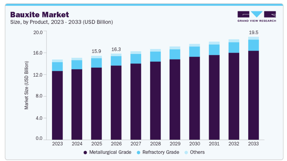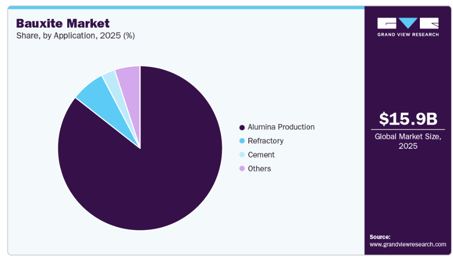 2025年には、アルミナ生産セグメントが85%を超える最大の売上シェアを占めました。新興国における製錬能力の拡大に加え、統合型アルミニウム生産業者による持続的な生産により、アルミナ精製所の処理量が増加しています。工業化、都市インフラの開発、および軽量で耐食性に優れた用途へのアルミニウム使用の増加は、アルミナ生産のための安定的かつ高品質なボーキサイト供給の必要性を引き続き強めています。