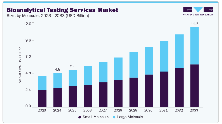 2024年において、低分子セグメントが55.67%という最大の収益シェアで市場をリードしました。このセグメントの成長は、低分子に関連する医療の進歩と未充足医療ニーズに起因します。さらに、低分子のバイオアナリティカル試験は、そのADME(吸収、分布、代謝、排泄)特性の解明、適切な投与量の決定、治療効果の評価、患者様の安全確保において極めて重要です。