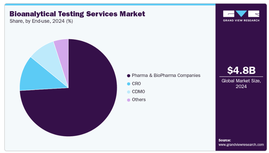 2024年時点で、製薬・バイオ医薬品企業セグメントが最大の市場収益シェアを占めました。この市場成長は、医薬品開発ライフサイクル全体における専門的試験の外部委託ニーズの高まりによるものです。これらの企業は、薬物動態研究、免疫原性評価、バイオマーカー検証など、複雑かつ高度に規制された性質を持つバイオ分析ワークフローの管理を、外部サービスプロバイダーに依存する傾向が強まっています。アウトソーシングにより、タイムラインの加速、社内インフラコストの削減、技術的専門知識や先進プラットフォームへのアクセスが可能となります。