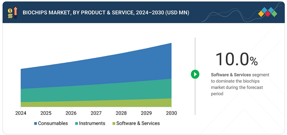 - バイオチップ市場は、機器、消耗品、ソフトウェア・サービスで構成されています。消耗品は、あらゆる試験やアッセイに必要であり、継続的な需要が保証されるため、最大のセグメントでした。研究、診断、臨床応用における頻繁な使用が、安定した収益と市場での優位性を支えています。