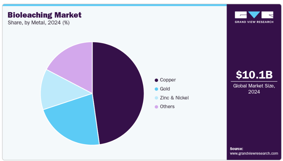 銅セグメントは2024年に47.8%の収益シェアを占めました。市場における銅セグメントは、複数の産業分野で銅の需要が世界的に増加していることから、著しい成長を遂げています。銅は電気配線、電子、再生可能エネルギーシステム、そして電気自動車において重要な構成要素であり、これら全てが世界的に急速な拡大を遂げています。銅抽出のための従来型の採掘手段は、環境問題や高品位鉱石の枯渇により持続可能性が低下しています。バイオリーシングは、低品位鉱石や採掘残渣から銅を抽出するエコフレンドリーで費用対効果の高い代替手段を提供し、鉱山会社が増加する需要に対応しつつ環境負荷を軽減することを可能にします。