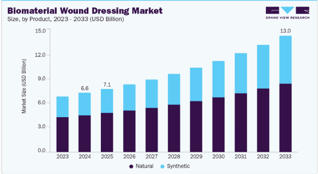 生体材料ベースのドレッシングは術後の回復を促進し、合併症リスクを低減するため、世界的に増加する外科手術件数も需要を押し上げています。生体活性ポリマー、コラーゲンベースの足場、抗菌複合材料などの技術進歩が製品の有効性を継続的に高めています。水分バランス調整型および再生型創傷治療への移行も市場の普及をさらに後押ししています。