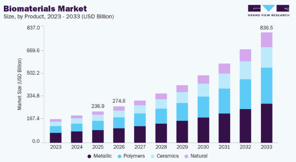 市場需要は、整形外科疾患の増加、歯科・顎顔面インプラントの使用拡大、低侵襲手術への嗜好の高まりによってさらに強化されている。高齢化と慢性疾患率の上昇に伴い、医療提供者は患者の回復を促進し再手術の必要性を低減する、耐久性のある高性能生体材料を優先している。同時に、積層造形や精密表面加工技術を含む製造技術の進歩により、スケーラビリティとカスタマイズ性が向上し、商業化が加速している。これらの革新が相まって、技術的に高度な生体材料が市場拡大の中核的推進力として確立されつつある。