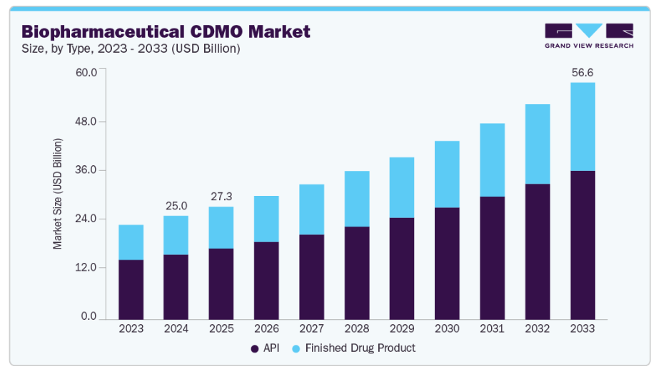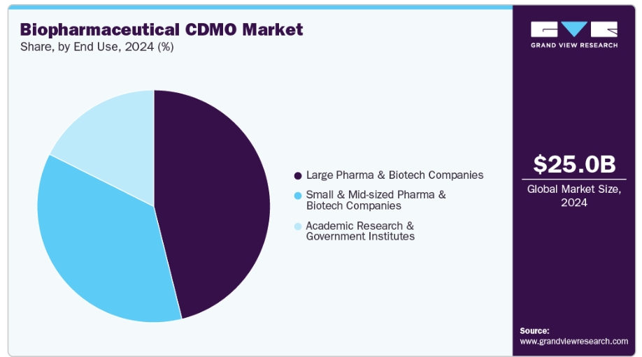 治療領域別では、予測期間中、2024年に腫瘍学セグメントが最大のシェアを占めました。このセグメントの成長は、がん罹患率の上昇、特許満了の増加、革新的治療法への需要拡大、製薬分野の研究開発投資の増加、ならびに腫瘍学薬剤および生物学的製剤の革新に対する要求の高まりによって牽引されています。例えば、Cancer Atlasによれば、2040年までに世界のがん患者数は2,900万人に達すると予測されています。これにより世界的に新たながん治療薬の需要が高まり、市場成長をさらに促進すると見込まれます。加えて、CDMO(受託開発製造機関)は、がん治療薬メーカーがコスト効率を高めながら迅速な市場参入を実現する支援を行い、市場成長を後押ししています。さらに、がん治療薬開発において、大半のバイオ医薬品CDMO企業は、バイオ医薬品・バイオシミラーの製造、標的治療薬送達のための先進的な製剤技術など、幅広い専門知識を提供しております。加えて、個別化がん治療への需要の高まりにより、バイオ医薬品CDMO企業は最先端施設、デジタル技術、柔軟な製造モデルへの投資を拡大しており、新たながん治療の革新において不可欠な協力者としての地位を確立しております。