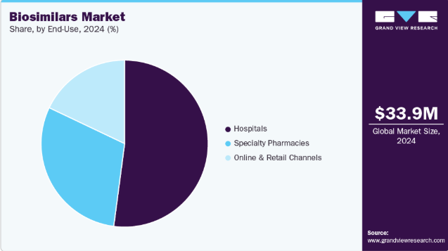 専門薬局セグメントは、在宅治療需要と患者利便性の高まりにより、予測期間中に17.94%という最速のCAGRで成長すると予測される。専門薬局はバイオシミラーを通じて高コスト生物学的製剤を低価格で提供する。強化された患者教育・カウンセリングプログラムが服薬遵守を支援する。技術統合により処方管理と薬剤配送が改善される。長期治療を要する慢性疾患の有病率増加が市場需要を強化する。バイオシミラーの直接流通は患者への迅速な供給を保証する。医療提供者との連携は治療フォローアップとモニタリングを強化する。専門薬局ネットワークの拡大は都市部および準都市部地域への到達範囲を拡大する。