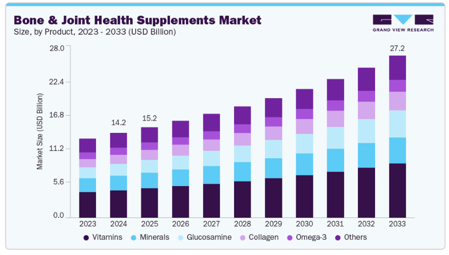 急速に増加する高齢者人口、整形外科疾患の有病率、微量栄養素欠乏症への認識の高まりといった要因が、この成長を牽引しております。