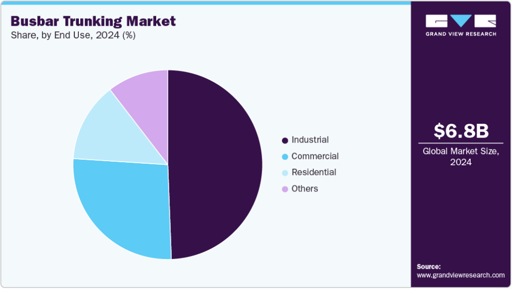 産業セグメントが市場を牽引し、2024年の世界収益の49.0%以上を占めました。この優位性は主に、産業環境に固有の高電力需要、運用上の複雑性、安全要件に起因しており、バスバートランキングシステムが効率的な電力分配の優先ソリューションとなっています。製造業、石油・ガス、鉱業、化学、自動車などの業界は、継続的で信頼性が高く拡張性のある電力供給システムに大きく依存している。バスバートランキングシステムは、モジュール設計、高い電流容量、メンテナンスの容易さにより、これらの要求を満たすのに理想的である。過酷な環境に耐え、ダウンタイムを最小限に抑え、将来の拡張をサポートする能力により、産業インフラにおいてますます不可欠なものとなっている。