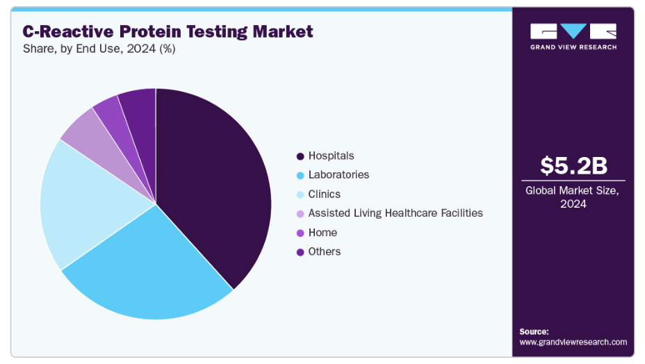 2024年時点で、病院が市場を支配し、収益シェアの38.29%を占めました。病院は、炎症性疾患の診断とモニタリングのためにCRP検査が実施される主要な医療現場として、市場において極めて重要な役割を果たしています。感染症、心血管疾患、自己免疫疾患の有病率の上昇により、病院におけるCRP検査の需要は大幅に増加しています。多くの病院では、迅速かつ正確な結果を確保するため、自動免疫比濁法およびELISAベースのCRP検査手段を検査室に導入しています。さらに、救急部門におけるポイントオブケア検査の重要性が高まっていることから、敗血症や心血管リスクなどの状態を迅速に評価するための高感度CRP(hs-CRP)測定法の採用が進んでいます。