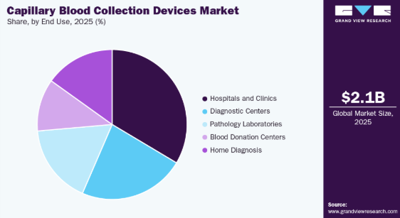 2025年には病院・診療所セグメントが33.56%の最大収益シェアで市場を牽引し、予測期間中も最速のCAGRで成長すると見込まれています。この増加は、診断検査への継続的な需要、患者来院の高頻度、そして継続的なモニタリングを必要とする慢性・急性疾患の有病率上昇によって推進されています。さらに、病院・診療所は従来型検査と専門検査の両方における主要実施場所として頻繁に利用されるため、毛細血管採血ツールへの安定した需要が生まれている。これらの環境における低侵襲性・操作簡便性・安全性強化を備えた機器の導入は、業務効率の向上、患者の快適性向上、検査結果提供時間の短縮をもたらし、セグメントの市場優位性に寄与している。