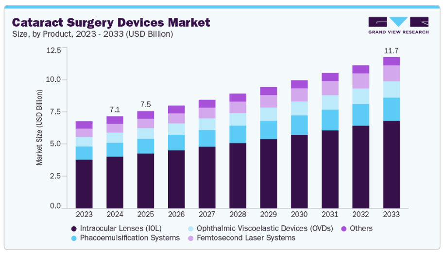 本市場の発展を牽引する主要因の一つは、特に高齢化に伴う白内障の有病率上昇です。白内障は世界的に最も一般的な失明原因の一つであり、加齢に伴い著しく増加します。米国国立医学図書館の論文によれば、高齢者、特に60歳以上の方々は加齢性白内障の影響を最も受けやすく、糖尿病や高血圧などの疾患が影響を及ぼすことが多いとされています。さらに、高齢化により1億8300万件以上の視力喪失症例が追加され、白内障は公衆衛生上の課題として深刻化しています。この人口動態の変化は、白内障手術および先進的な手術機器への需要を加速させるでしょう。