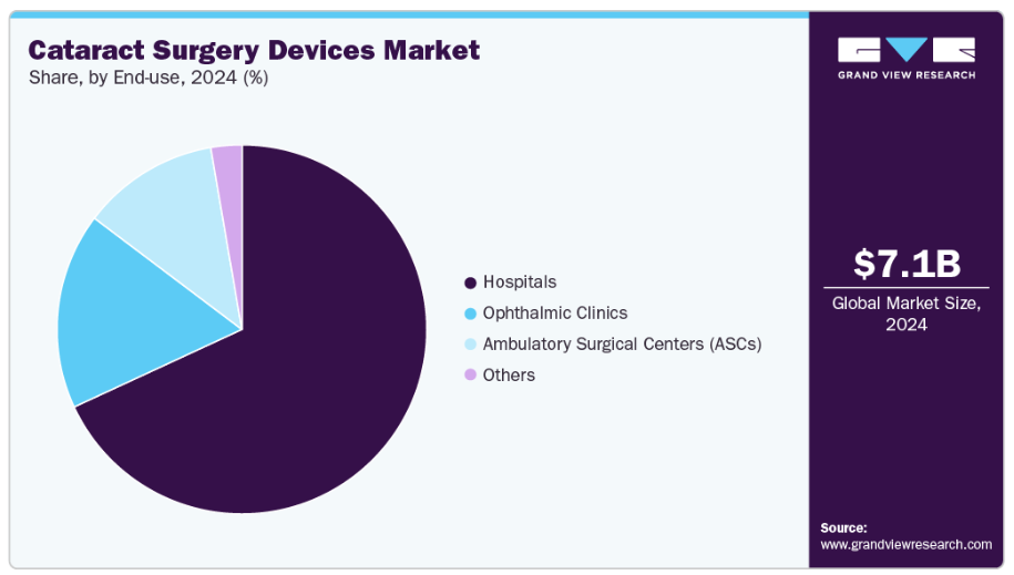 近年、外来手術および外来手術センター(ASC)への移行が著しく進んでいます。これらの施設は、手術費用の低減、患者流動性の向上、アクセスの改善を実現しており、白内障手術において非常に魅力的な選択肢となっています。例えば、ユニファイ・ビジョン・パートナーズ社は2023年にインサイト・ビジョン・グループを買収しました。後者はカリフォルニア州に2つの多専門外来手術センターを擁しており、産業が外来医療施設を拡大する傾向を象徴しています。外来環境に適した手術機器の開発需要は、外来手術センターでの白内障手術が増加するにつれて高まり、白内障手術機器業界のさらなる成長につながります。